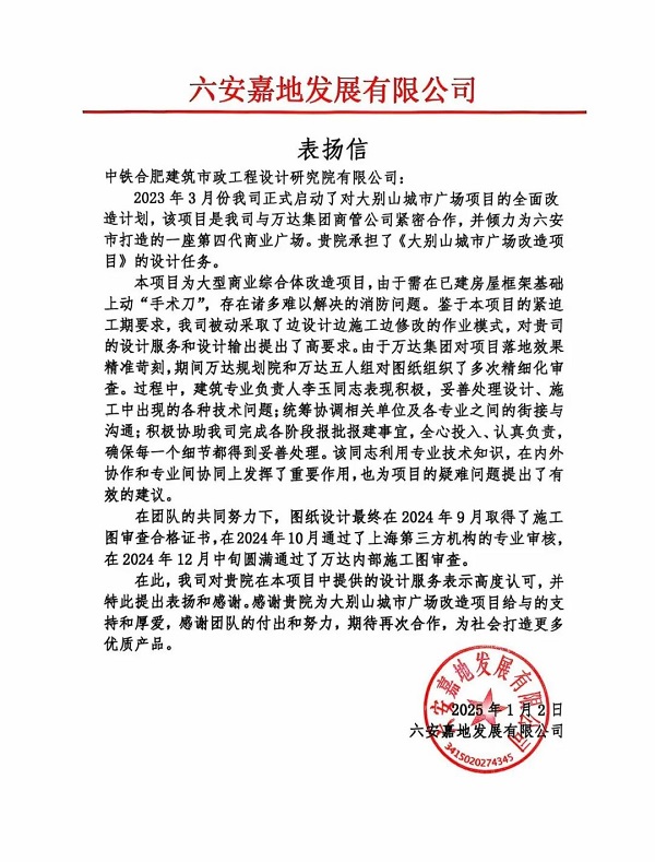 信中指出,合肥院一分院大别山城市广场改造项目团队及项目建筑专业负责人李玉在项目建设中表现积极,妥善处理设计、施工中出现的各种技术问题;统筹协调相关单位及各专业之间的衔接与沟通;积极协助业主单位完成各阶段报批报建事宜,全心投入、认真负责,确保每一个细节都得到妥善安排;为项目阶段节点顺利推进作了突出贡献。
