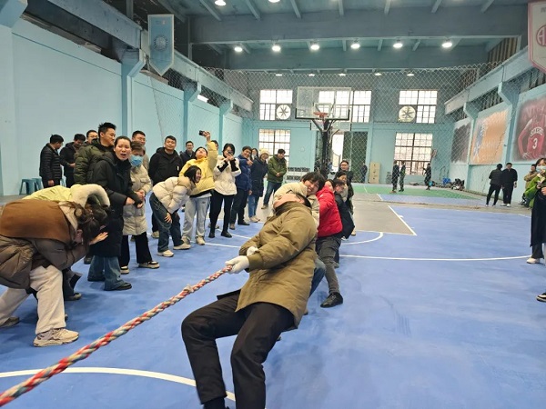 本次迎新活动分为拔河比赛和掼蛋两个项目进行,拔河比赛全院职工踊跃报名,每个分会组成3支队伍,4个分会共12支队伍近百人参赛。比赛以篮球场中间线为界,角逐的两队人数相等,均为男女混合组队,各队队员依次交错站于拔河绳两侧。待裁判鸣哨后,先将拔河绳中间的标志带拉过本队界线的队伍即为胜方。比赛采用三局两胜制,胜者进入下一轮,每轮比赛中间休息调整10分钟。